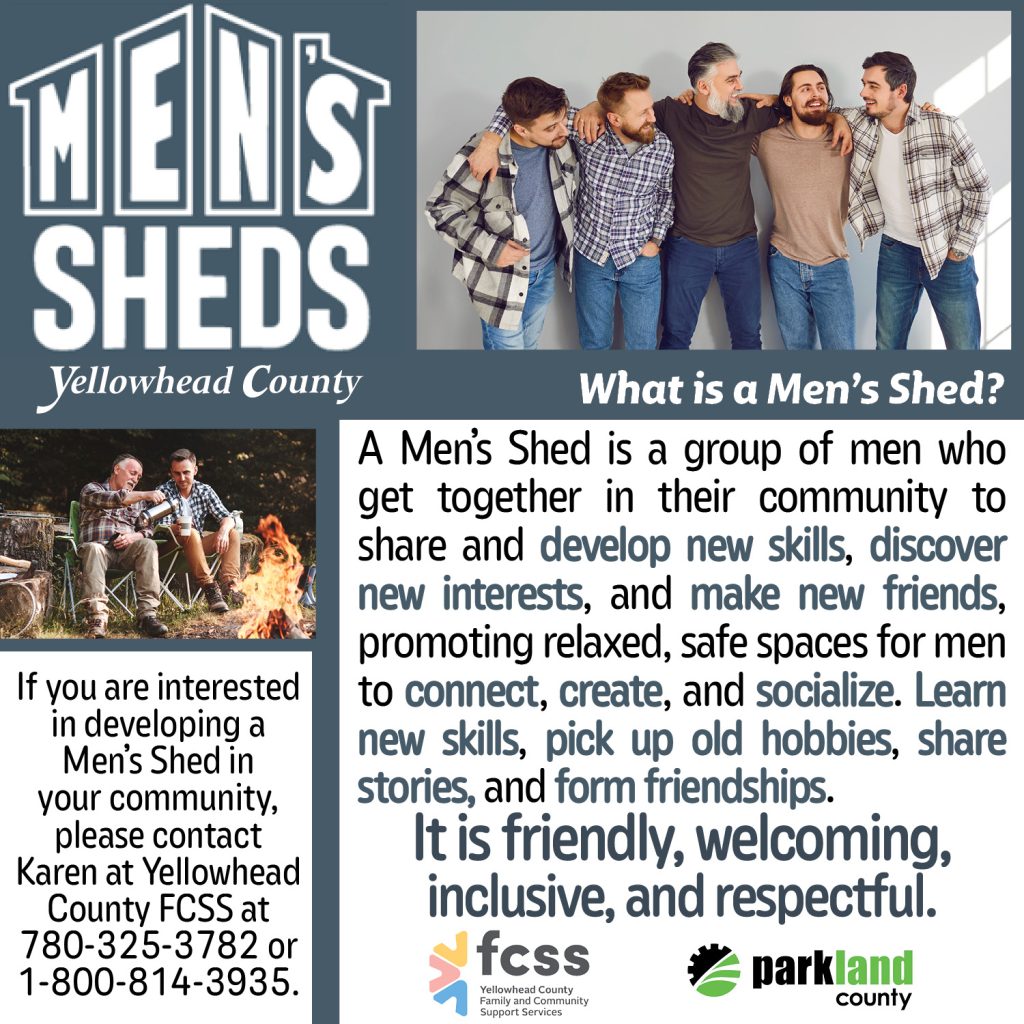 If you are interested in developing a Men’s Shed in your community, please contact Karen at Yellowhead County FCSS at 780-325-3782 or 1-800-814-3935.