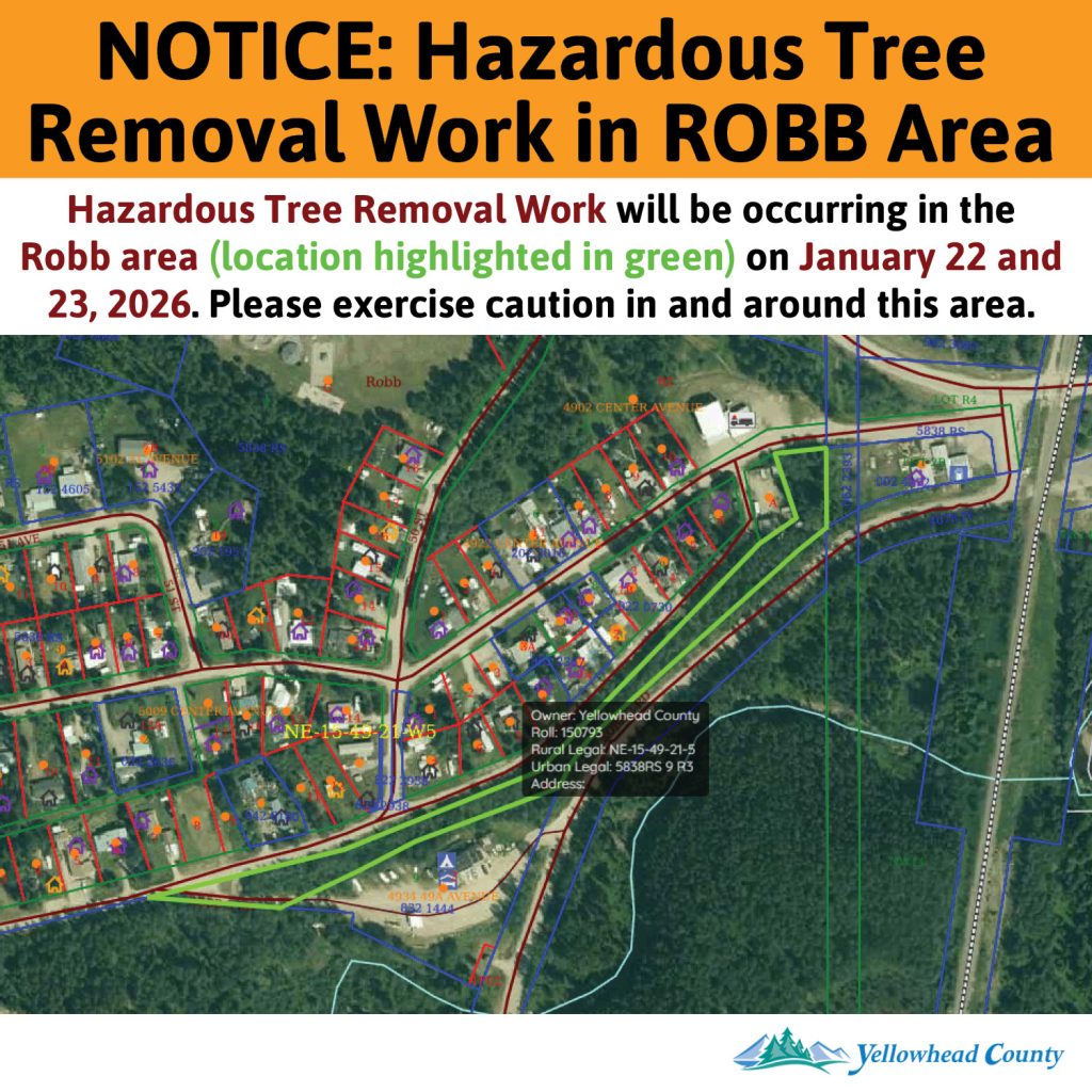 Hazardous Tree Removal Work will be occurring in the Robb area (location highlighted in green) on Thursday, January 22 and Friday, January 23.