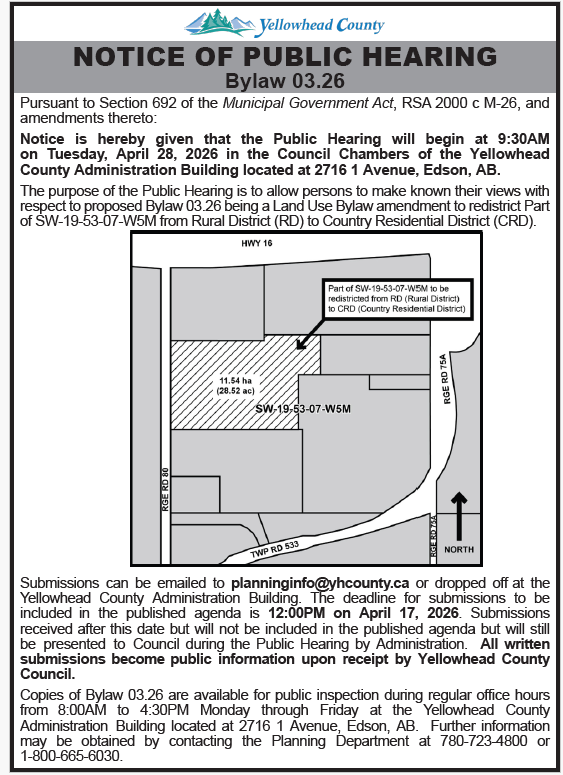 Contact the Yellowhead County Planning Department at 1-800-665-6030