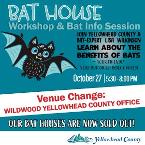 The workshop will take place on October 27th 2025 from 5:30pm-8:00pm at the Wildwood Yellowhead County Office. All supplies for painting and decorating the bat houses will be provided.