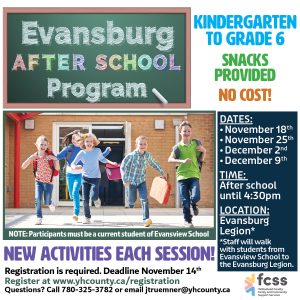 Please note: There are limited spaces and participants must currently attend Evansview School. Staff will walk with students from Evansview School to the Evansburg Legion.
