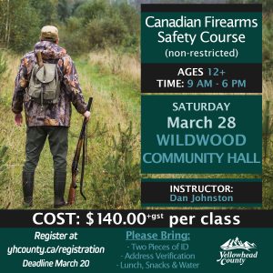 ADDITIONAL DATE OPTION: Another Firearms Safety Course (non-restricted) will be held in Peers on Saturday, February 21. Further details available on our calendar or at www.yhcounty.ca/registration