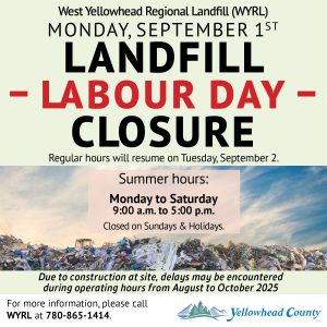 The WYRL Landfill south of Hinton will be CLOSED on Monday, September 1 for Labour Day.