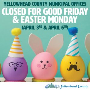 Yellowhead County’s offices in Edson and Wildwood will be closed on Friday, April 3 and Monday, April 6 in honour of Good Friday and Easter Monday.