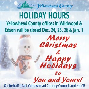 The Yellowhead County offices in Edson and Wildwood will be closed from Wednesday, December 24 to Friday, December 26.