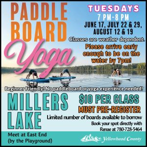 Paddleboard Yoga requires pre-registration and costs $10 per class. You can book your spot directly with Renae at 780-728-5464.