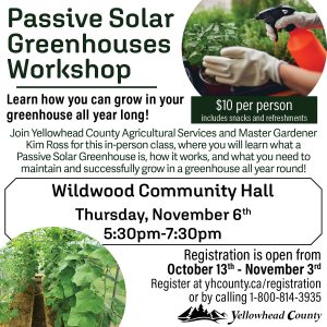 Join Yellowhead County Agricultural Services and Master Gardener Kim Ross for a two-hour in person class on Passive Solar Greenhouses. The course will be held at the Wildwood Community Hall on Thursday November 6th from 5:30pm-7:30pm.