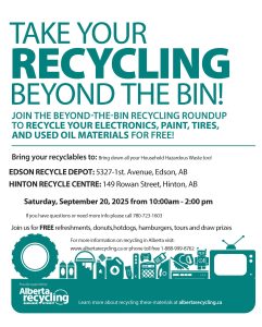 On Saturday September 20 from 10am – 2pm, you can bring your recyclables to either the Edson Recycle Depot (5327 1st Ave, Edson) or the Hinton Recycle Centre (149 Rowan Street, Hinton).